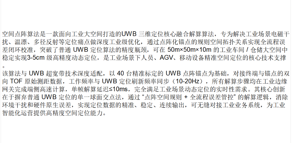 普通 UWB 算法是 “就数据解算数据”,仅通过简单滤波 + 球面交点法解算坐标,无法解决工业场景的系统误差、数据失真、实时性不足等问题,定位精度低且稳定性差;而空间点阵算法是 **“点阵拓扑为基 + 全流程误差管控 + 工业级定制优化”**,通过点阵规则实现误差闭环校准,结合多算法融合、端侧计算、自优化等设计,彻底解决工业场景的定位痛点,在精度、稳定性、实时性、场景适配性上形成全方位碾压优势,是工业大空间高精度三维定位的核心技术支撑。