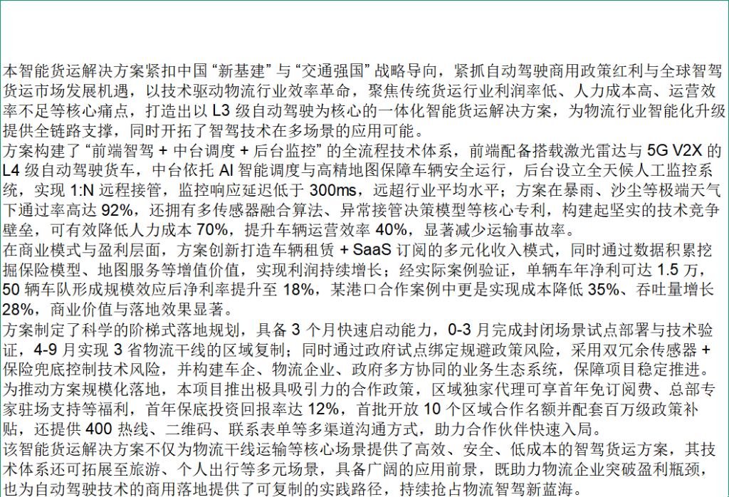 方案技术体系与货运行业实际需求深度耦合,既实现核心货运场景的精准适配、高效落地,又具备极强的技术复用性,可实现跨领域场景延伸,叠加政策与生态加持,场景落地价值与拓展潜力兼具: