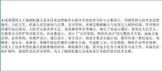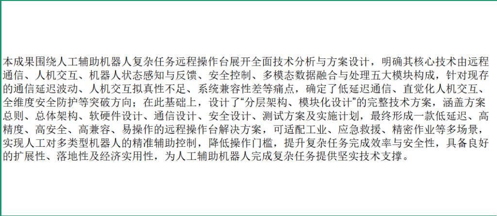 本成果围绕人工辅助机器人复杂任务远程操作台展开全面技术分析与方案设计,明确核心技术体系并针对性突破现存痛点,形成的解决方案核心指标与突出优势如下:一、主要技术指标,全面覆盖通信、操控、安全、兼容性等关键维度,确保方案落地可行性:通信指标方面,采用“5G专网+光纤+WiFi6”冗余架构,5G端到端延迟≤50ms、光纤延迟≤10ms、WiFi6延迟≤30ms,丢包率≤0.1%,5G带宽≥1Gbps、光纤传输速率≥10Gbps、WiFi6传输速率≥1.2Gbps,支持掉线重连(重连时间≤3秒)与多链路自动切换;操控指标方面,力反馈精度≤0.05N,机器人动作定位误差≤0.3mm,指令响应延迟≤30ms,数据处理延迟≤20ms,支持多自由度精准操控与多机器人协同控制;安全指标方面,硬件防护等级≥IP65,支持双重紧急停机机制,采用AES-256数据加密,权限分级管理,故障自诊断响应时间≤1秒,备用电源续航≥2小时;兼容性指标方面,支持Ethernet/IP、Modbus等主流工业接口,可适配不同品牌、不同类型机器人(工业机械臂、防爆机器人等),支持多机器人同时接入;环境适配指标方面,可耐受高温50℃、高湿85%RH环境,具备强电磁干扰抗性。二、核心优势,精准破解行业痛点、凸显方案竞争力:一是低延迟高可靠,通过冗余通信架构与智能补偿技术,解决复杂环境下通信延迟波动、丢包问题,适配户外、弱网等多场景;二是直觉化精准操控,融合力反馈、AR增强现实与人体工程学设计,提升操作拟真性,降低操作门槛,实现亚厘米级精细操控;三是全维度安全防护,构建“硬件+软件+数据”三重防护体系,防范操作风险、设备故障与数据泄露,适配高危、涉密场景;四是高兼容易扩展,采用标准化接口与开放式API,支持多型号机器人接入及功能升级,降低用户采购与维护成本;五是高落地高适配,工业级硬件选型与场景化软件优化,可直接适配工业、应急救援、精密作业等多领域,具备良好的经济实用性与可实施性;六是全流程可追溯,支持数据实时存储(存储周期≥1年)与操作回溯,助力任务复盘、故障排查与操作员培训,为人工辅助机器人完成复杂任务提供全方位、高可靠的技术支撑。