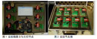 该实验平台共包含三个箱体(一个主控箱和两个实验节点箱),共计22个节点,十个综合实验项,如图1和2。其中主控箱是所有节点实验的控制与显示中心,包含液晶触摸显示屏、多功能底板及六个实验节点,其它箱内分别含有八个实验节点。各箱体均内含市电接入与变换电路,可实现对节点的无线充电功能。