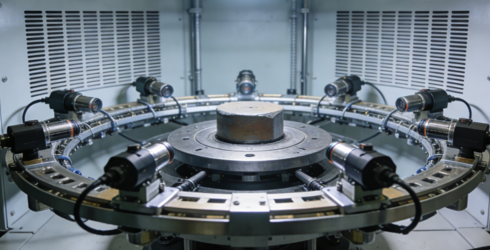本发明公开了一种工件表面缺陷的全方位自动检测装置,包括用于传送工件的传送装置和用于检测工件表面缺陷的视觉检测模块,所述的传送装置包括第一传送带和第二传送带,第一传送带和第二传送带部分紧贴,形成将工件翻转并从第一传送带传送至第二传送带的工件翻转通道,工件在第一传送带上时的底面,原本很难检测其表面的缺陷,经过工件翻转通道后翻转,从而通过视觉检测模块可以方便准确地检测其表面缺陷。本发明工件表面缺陷的全方位自动检测装置为一流水线式,其结构简单、易于实现和可控性好,能够快速、高效、大批量地检测工件表面缺陷,特别适用于检测六面体工件,具有优良的应用前景。